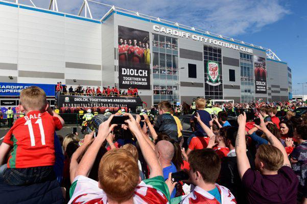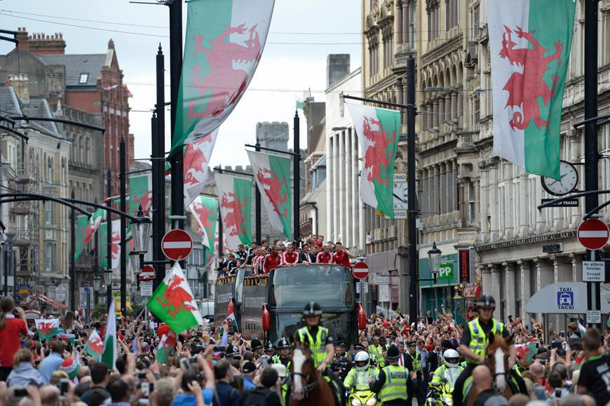 Χιλιάδες φίλαθλοι κατέκλυσαν τους δρόμους του Κάρντιφ για να υποδεχθούν την αποστολή της εθνικής ομάδας ποδοσφαίρου της Ουαλίας που επέστρεψε από τα γήπεδα της Γαλλίας και το EURO 2016.