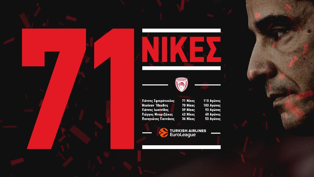 Η νίκη του Ολυμπιακού με 80-79 επί της Ρεάλ εήταν η 71η του Γιάννη Σφαιρόπουλου στον «ερυθρόλευκο» πάγκο και χάρις σ’ αυτή έγινε ο πολυνίκης προπονητής στην ιστορία της ομάδας στις ευρωπαϊκές διοργανώσεις.