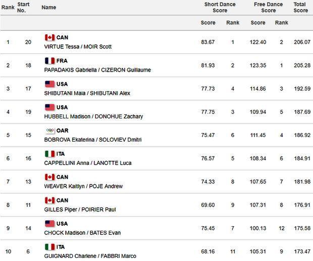 Σε συνδυασμό με τους 81.93 που είχαν συγκεντρώσει από το σύντομο πρόγραμμα έφτασαν τους 205.28 και τελικά κατέκτησαν το ασημένιο μετάλλιο. Το χρυσό τελικά κατέληξε στην Τέσα Βιρτό και τον Σκοτ Μοάρ. Το ζευγάρι από τον Καναδά μπορεί να ήταν δεύτερο με 122.40 βαθμούς στο ελεύθερο πρόγραμμα, ωστόσο μαζί με τους 83.67 που είχαν πάρει στο σύντομο έφτασαν τους 206.07 και έτσι κατέκτησαν το χρυσό μετάλλιο.