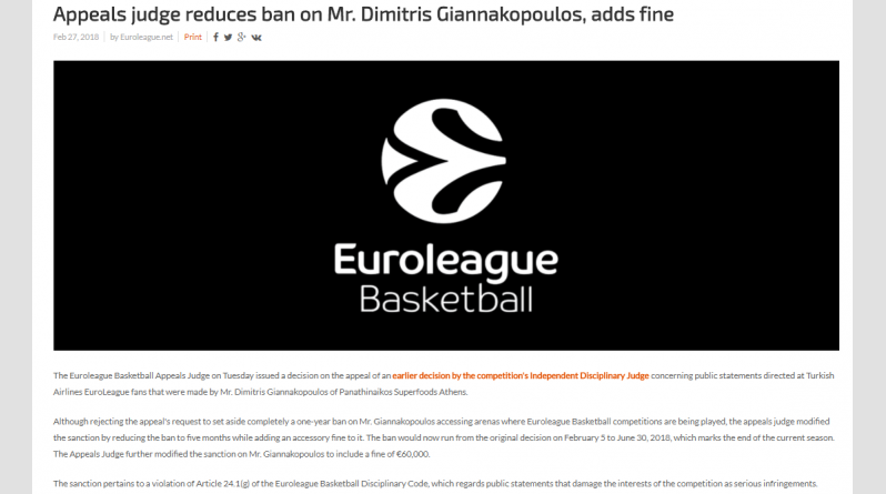 Αυτό σημαίνει πως ο Γιαννακόπουλος δεν θα μπορέσει να βρεθεί ούτε στο ΟΑΚΑ, αλλά ούτε και σε κάποιο άλλο ευρωπαϊκό γήπεδο μέχρι το τέλος της σεζόν.