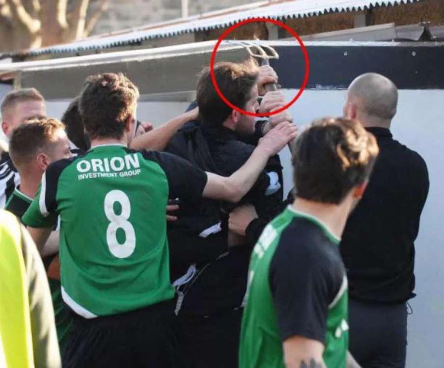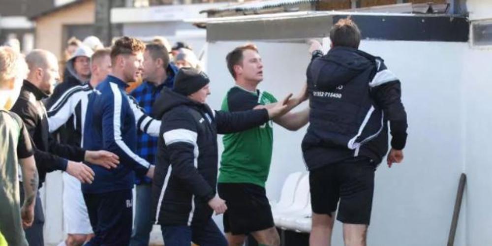 Οι παίκτες των Μπάρμουθ και Γκρίνφιλντ ήρθαν στα χέρια με τον προπονητή της δεύτερης κάποια στιγμή να φεύγει και να επιστρέφει με μια τσουγκράνα!