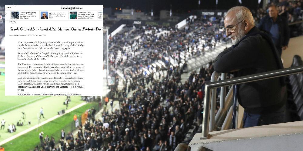 Όπως είναι φυσικό, ξένα ΜΜΕ καταγράφουν το πρωτοφανές γεγονός με ανταποκρίσεις αλλά και σχολιασμό. Το Associated Press κείμενο του οποίου χρησιμοποιούν και οι New York Times, κάνει λόγο για «Ελληνικός αγώνας διεκόπη, μετά την ένοπλη διαμαρτυρία του ιδιοκτήτη για την απόφαση του διαιτητή».
