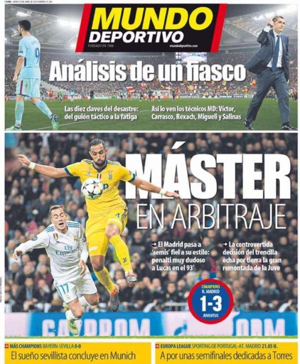«Η κλοπή του αιώνα» είναι ο τίτλος της καταλανικής Sport, η οποία προσθέτει πως ο διαιτητής ανακάλυψε ένα πέναλτι με το οποίο η Ρεάλ Μαδρίτης προκρίθηκε στα ημιτελικά. Μάλιστα χαρακτηρίζει «σκάνδαλο» την αποβολή του Μπουφόν στη φάση του πέναλτι για διαμαρτυρία.