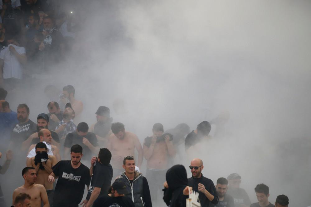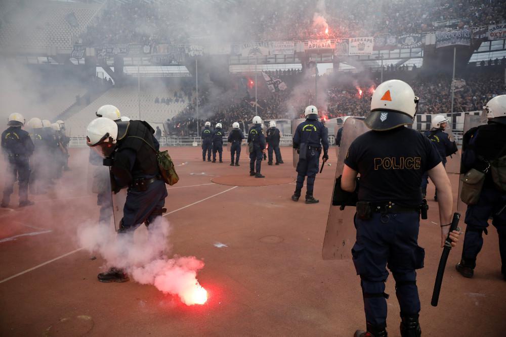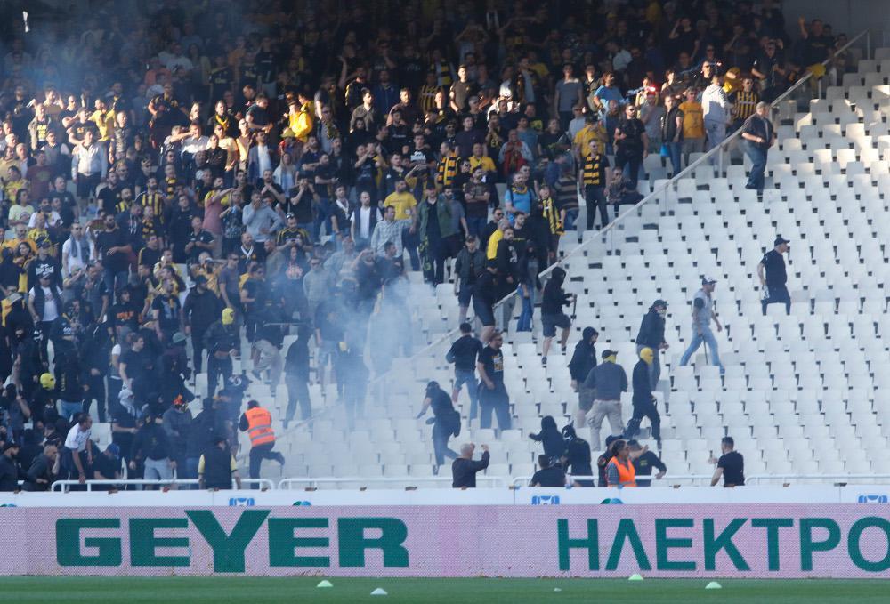 Όπως έγινε γνωστό από την Αστυνομία, ομάδες οπαδών της ΑΕΚ βγήκαν από τις θύρες 3 και 7 του σταδίου και επιτέθηκαν στις αστυνομικές δυνάμεις, με φωτοβολίδες και άλλα αντικείμενα.