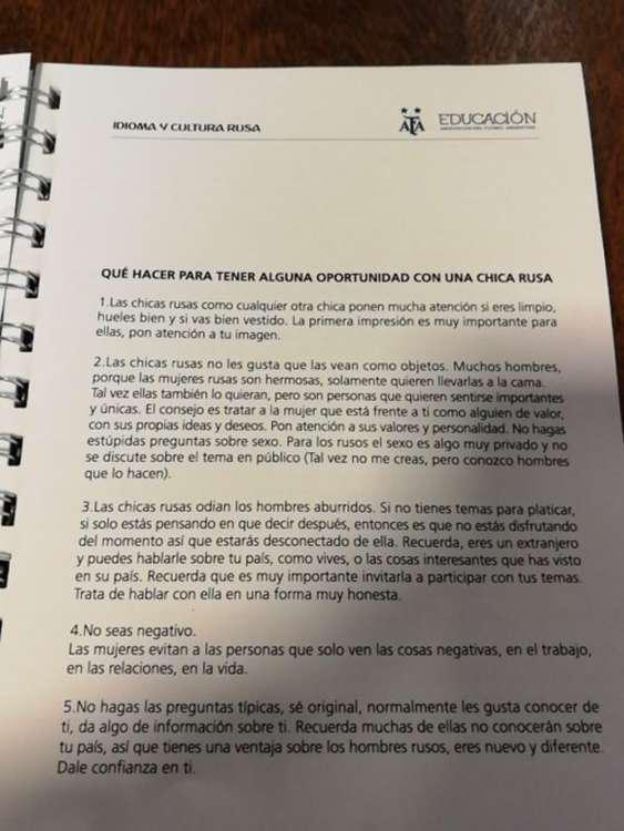 Όμως η αργεντίνικη ομοσπονδία ποδοσφαίρου προνόησε και για την ερωτική ζωή των οπαδών και στο εγχειρίδιο που έφτιαξε, μέσω του οποίου δίνονται συμβουλές για την ιδανική διαμονή στη Ρωσία, ενώ υπάρχει και ξεχωριστό κεφάλαιο με τίτλο: «Τι να κάνετε ώστε να έχετε μία ευκαιρία με κάποια Ρωσίδα».
