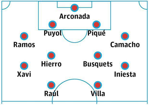Σε σύστημα 4-4-2, κάτω από τα δοκάρια ο Κασίγιας επέλεξε τον Αρκονάδα και όχι τον ίδιο, στην άμυνα τους Καμάτσο (αριστερά), Πουγιόλ, Πικέ και Ράμος (δεξιά), στη μεσαία γραμμή προτίμησε τους Ιέρο και Μπουσκέτς, εσωτερικούς μέσους τους Τσάβι και Ινιέστα ενώ στη γραμμή κρούσης τούς Βίγια και Ραούλ.