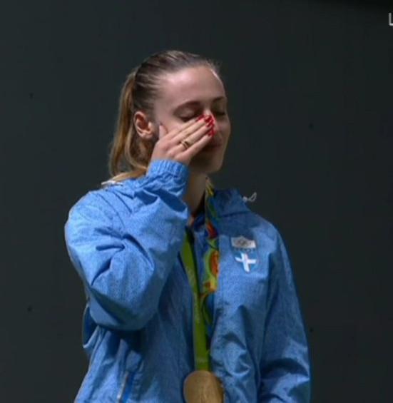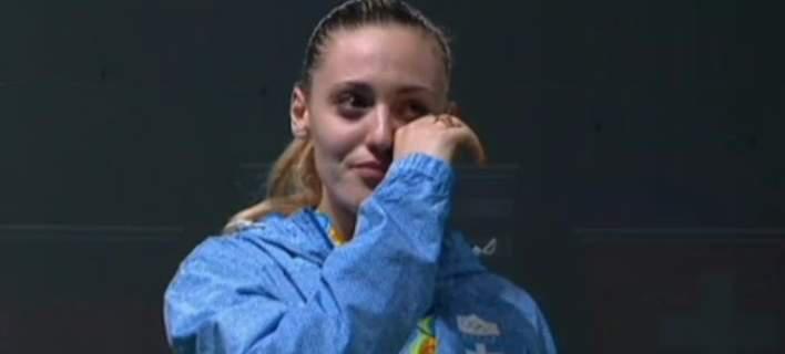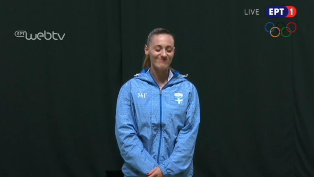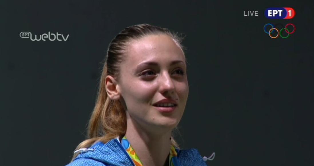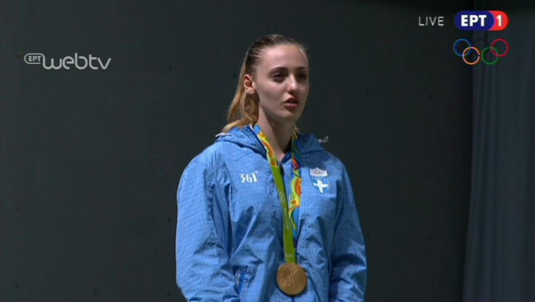 Η 20χρονη αθλήτρια δεν κατάφερε να συγκρατήσει τη συγκίνησή της. Δακρυσμένη, τραγουδούσε τους στίχους του εθνικού ύμνου, απολαμβάνοντας το μεγαλείο της μοναδικής στιγμής.
