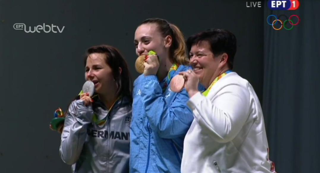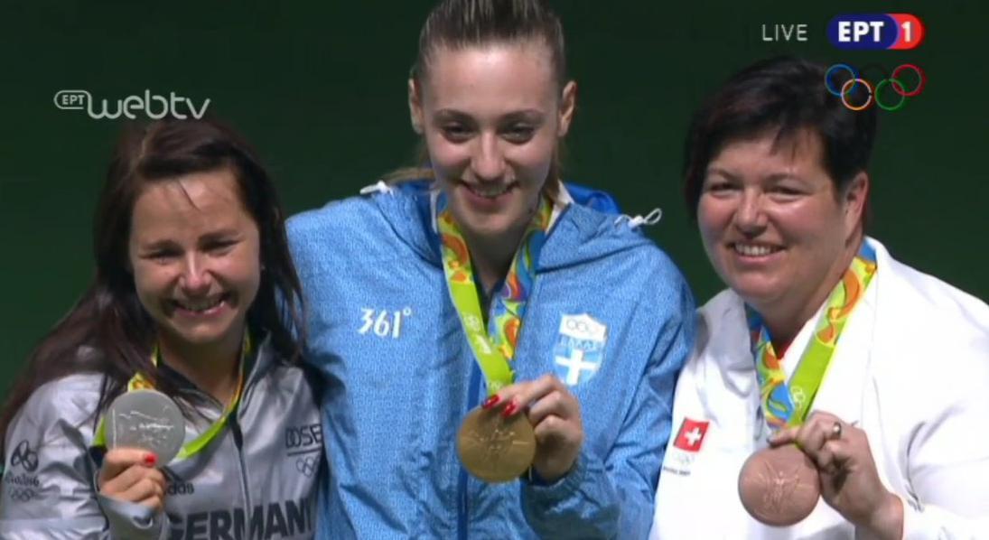 Λίγα λεπτά μετά από την τεράστια επιτυχία της 20χρονης αθλήτριας της σκοποβολής στο πιστόλι 25 μ., όπου κατέκτησε το χρυσό μετάλλιο, ανέβηκε για δεύτερη φορά στο βάθρο των Ολυμπιακών αγώνων στο Ρίο της Βραζιλίας, έπειτα από το χάλκινο που είχε κερδίσει την Κυριακή στα 25 μ. αεροβόλο.