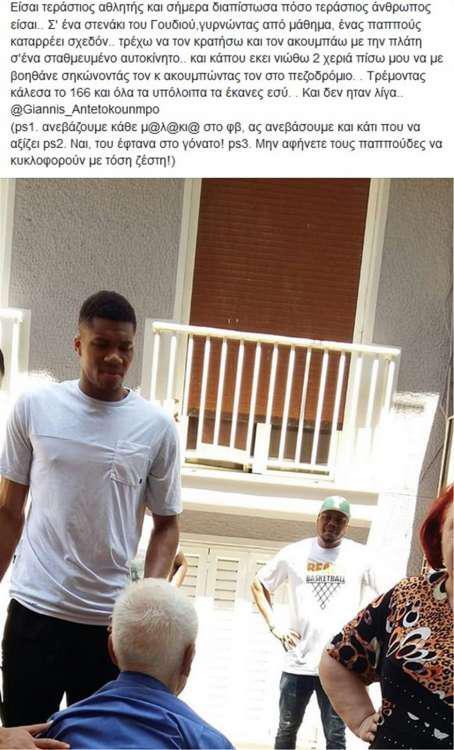 «Είσαι τεράστιος αθλητής και σήμερα διαπίστωσα πόσο τεράστιος άνθρωπος είσαι.. Σ’ ένα στενάκι του Γουδιού,γυρνώντας από μάθημα, ένας παππούς καταρρέει σχεδόν.. τρέχω να τον κρατήσω και τον ακουμπάω με την πλάτη σ’ένα σταθμευμένο αυτοκίνητο.. και κάπου εκει νιώθω 2 χεριά πίσω μου να με βοηθάνε σηκώνοντάς τον κ ακουμπώντας τον στο πεζοδρόμιο. . Τρέμοντας κάλεσα το 166 και όλα τα υπόλοιπα τα έκανες εσύ. . Και δεν ηταν λίγα.. @Giannis_Antetokounmpo”.