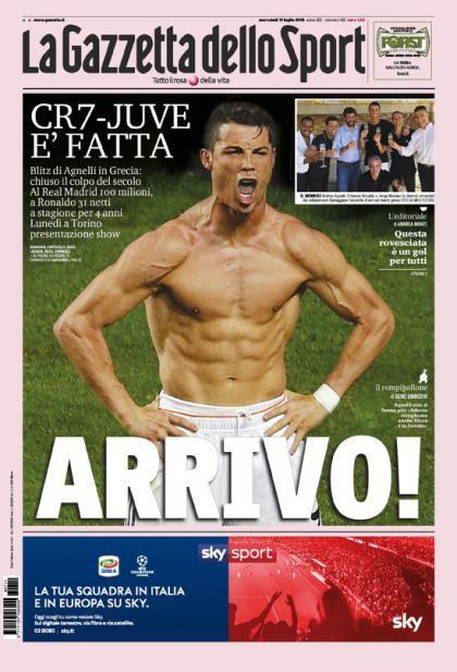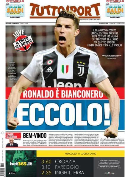 «Η Γιούβε στο χτύπημα του αιώνα. Ο Ρονάλντο είναι μπιανκονέρο και είναι εδώ», γράφει η Tuttosport. Η Corriere dello Sport «παίζει» με τη FIAT του Ανιέλι που πυροδότησε τη «βόμβα» με τον Ρονάλντο γράφοντας: «FIAT LUX, το όνειρο με τον CR7 είναι πραγματικότητα, η Γιούβε φωτίζει τη Serie A ξανά». Από τη μεριά της η Gazzetta dello Sport γράφει: «Έφτασε! CR7 και Γιούβε, είναι γεγονός».