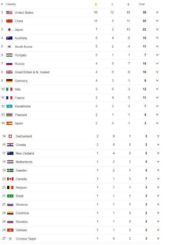 Η Ιαπωνία βρίσκεται στην 3η θέση με τα συνολικά μετάλλια ενώ η Ρωσία στην 4η. Η Ελλάδα υποχώρησε κατά επτά θέσεις και ισοβαθμεί με την Τσεχία, μετά την αποτυχία των Νικολαΐδου και Ασουμανάκη στον τελικό του διπλού σκιφ γυναικών.