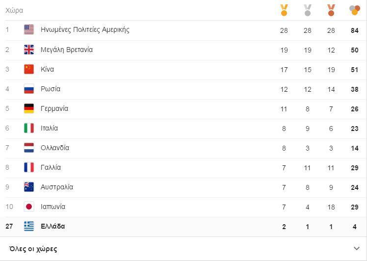 Δεν άλλαξε κάτι στην κορυφή της κατάταξης, με τις ΗΠΑ να παραμένουν πρώτες με 28 χρυσά και τη Μεγάλη Βρετανία και την Κίνα να ακολουθούν με 19 και 17 χρυσά μετάλλιο αντίστοιχα.