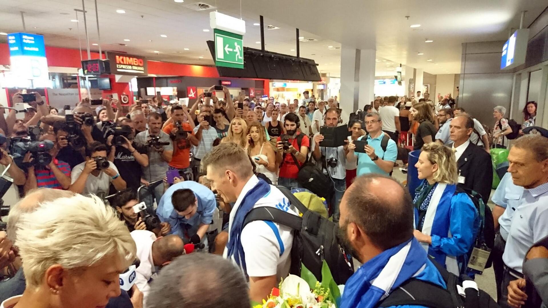 Ο Γιαννιώτης εμφανίστηκε στην αίθουσα αφίξεων με μια γαλανόλευκη στους ώμους και ένα τεράστιο χαμόγελο στο πρόσωπο του. Ο κόσμος που βρισκόταν εκεί άρχισε να του φωνάζει μπράβο και να τον χειροκροτεί μέσα σε κλίμα συγκίνησης.