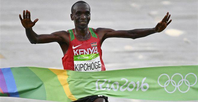 Για πρώτη φορά στην Ιστορία του Μαραθωνίου των Ολυμπιακών Αγώνων, αναδείχθηκαν Ολυμπιονίκες από την ίδια χώρα σε άνδρες και γυναίκες. Μετά την Τζεμίμα Τζέλαγκατ Σουμγκόνγκ, που νίκησε τον Μαραθώνιο γυναικών, ήρθε ο Ελιούντ Κιπτσόγκ να νικήσει τον Μαραθώνιο ανδρών. Ο Κενυάτης δρομέας τερμάτισε πρώτος με χρόνο 2:08:44, αφήνοντας δεύτερο τον Αιθίοπα Φεϊζά Λιλέσα με 2:09:54 και τρίτο τον Αμερικανό Γκάλεν Ραπ με 2:10:05. Είναι η δεύτερη φορά που ένας Κενυάτης νικά στον Μαραθώνιο, μετά τον Σάμουελ Βανζίρου το 2008 στο Πεκίνο.