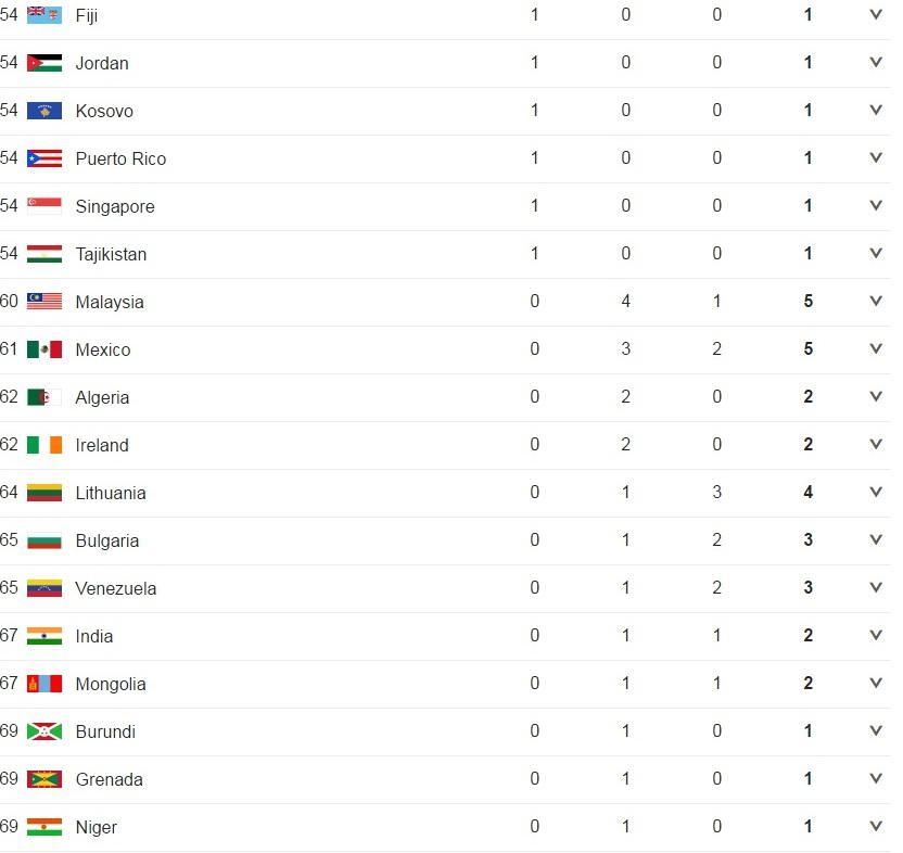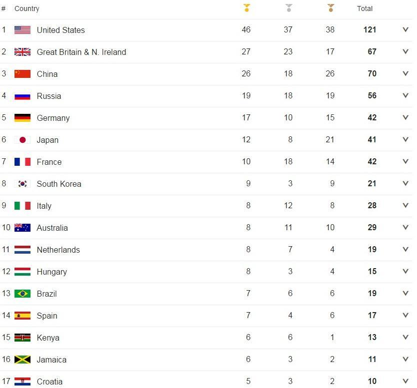 Στην 1η θέση τερμάτισαν οι Η.Π.Α. με σύνολο 121 μετάλλια, εκ των οποίων τα 46 ήταν χρυσά ενώ ακολούθησε η Μεγάλη Βρετανία με 27 χρυσά. Η Κίνα ήταν πάντως αυτή που στη συνολική συγκομιδή τερμάτισε δεύτερη με 70 μετάλλια έχοντας πάντως ένα χρυσό λιγότερο από τους Βρετανούς.