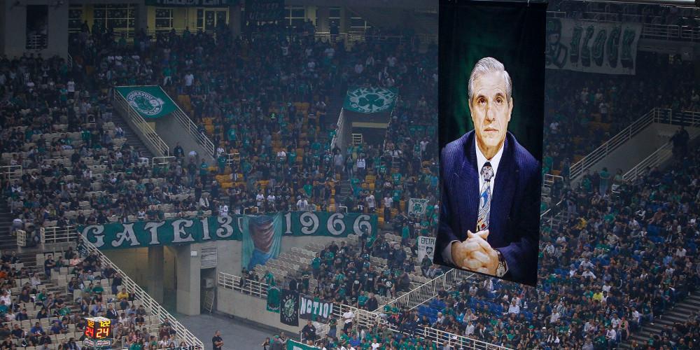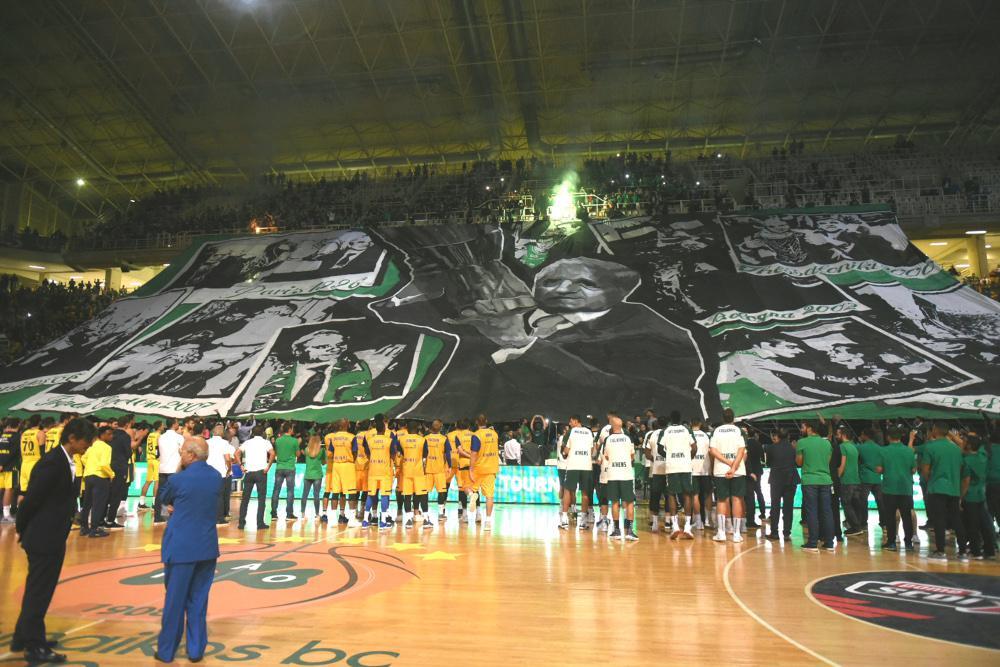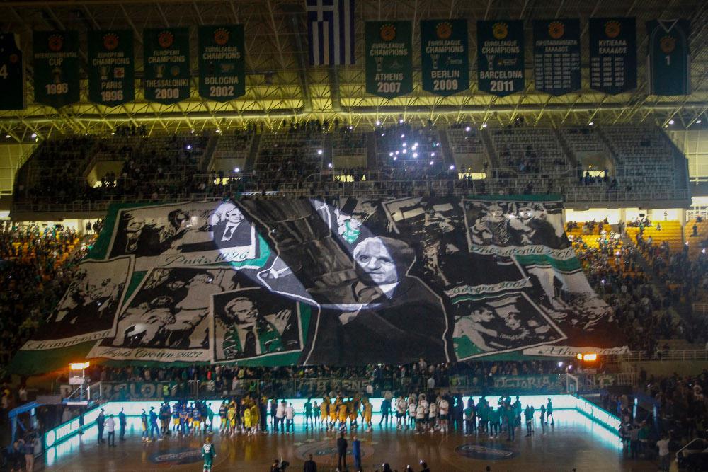 Στις κερκίδες πίσω από τη γραμματεία αποκαλύφθηκε ένα εντυπωσιακό coreo, το οποίο απεικονίζει τη μορφή του Παύλου Γιαννακόπουλου και δίπλα του μεγάλες στιγμές από τις επιτυχίες του Παναθηναϊκού, το διάστημα της θητείας του στο «τριφύλλι».