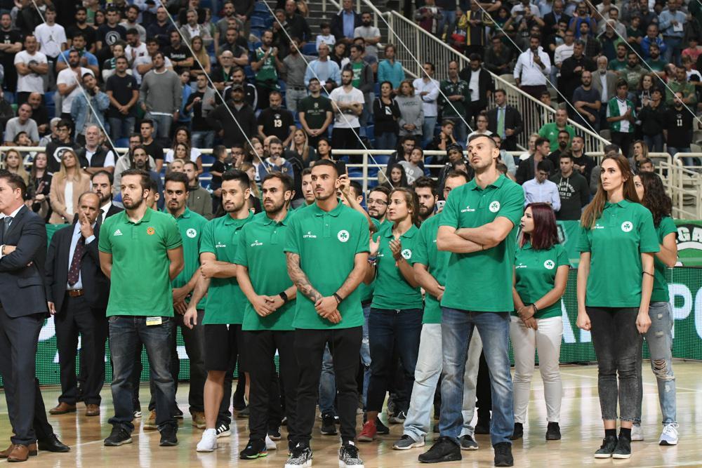 Το λάβαρο του ιστορικού παράγοντα της ΚΑΕ πήρε τη θέση του στον ουρανό του κλειστού των Ολυμπιακών Εγκαταστάσεων… θαυμάζοντας στο παρκέ σύσσωμη την παναθηναϊκή οικογένεια (ήταν εκεί η ομάδα μπάσκετ, η ομάδα ποδοσφαίρου και ο Ερασιτέχνης).