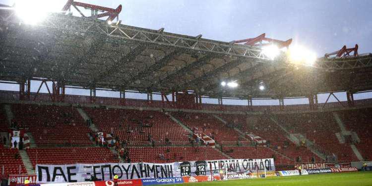«ΠΑΕ ξεπουλημένη, τσιράκια οπαδοί», αναγράφει το τεράστιο πανό των φίλων του Ολυμπιακού.