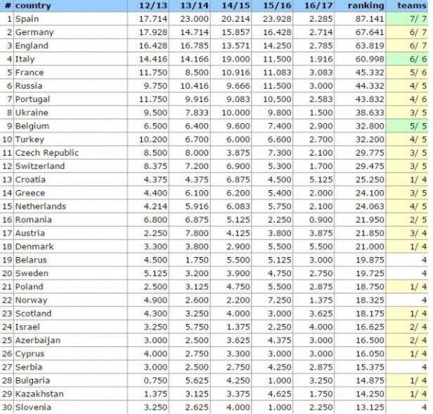 Η Κροατία (25.250 βαθμοί), που βρίσκεται μία θέση πάνω από εμάς, συνεχίζει μόνο με τη Ντιναμό Ζάγκρεμπ, στους ομίλους του Champions League, ενώ η Ολλανδία (24.063) που είναι πίσω μας εξακολουθεί με πέντε ομάδες, η 16η Ρουμανία (21.950) με δύο και η 17η Αυστρία (21.850) με τρεις.