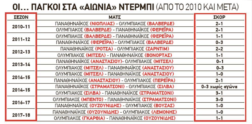 Αυτό αποδεικνύεται και από το γεγονός ότι στα τελευταία οκτώ χρόνια 16 προπονητές έχουν ζήσει την εμπειρία του μεγάλου ντέρμπι του ελληνικού ποδοσφαίρου και μόνο τρεις χρονιές ήταν ίδιοι τεχνικοί στις δύο ομάδες και στους δύο γύρους.