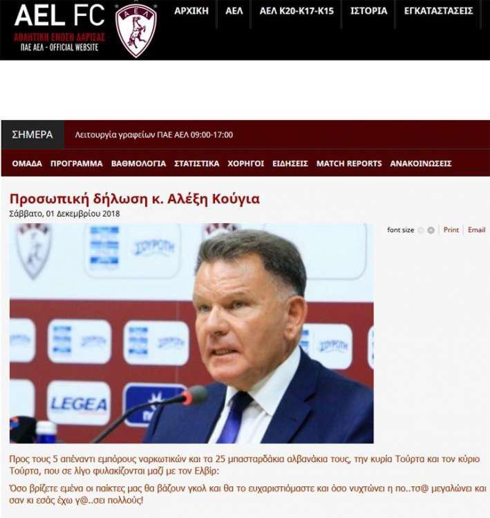 Ο Αλέξης Κούγιας με προσωπική του δήλωση μέσω της επίσημης ιστοσελίδας της ΑΕΛ απάντησε με εξίσου υβριστικό τρόπο, χρησιμοποιώντας απίστευτα σκληρές εκφράσεις.