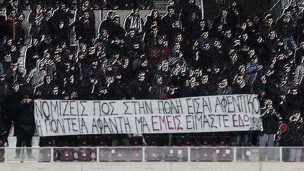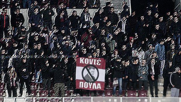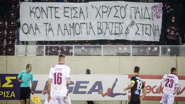Σε όλη τη διάρκεια της αναμέτρησης ακούγονταν υβριστικά συνθήματα εναντίον του μεγαλομετόχου της ΑΕΛ ενώ υπήρχαν και πανό με ειρωνικά μηνύματα.