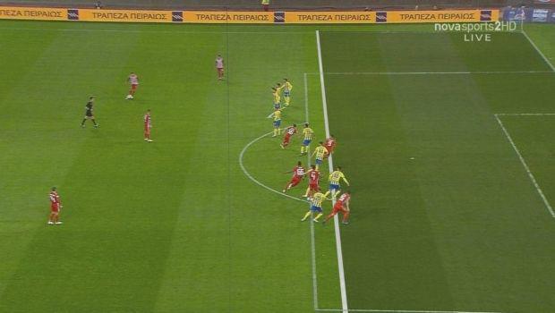 Ο βοηθός διαιτητή δεν είδε την παράβαση και η μπάλα από την κεφαλιά του Σέρβου στόπερ κατέληξε στον Γκερέρο που πέτυχε από κοντά το 2-0 του Ολυμπιακού επί της ομάδας του Αγρινίου.