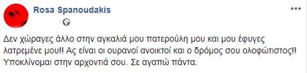Την είδηση του θανάτου του Αλέκου Σπανουδάκη έκανε γνωστή η κόρη του με post στον λογαριασμό της στο Facebook.