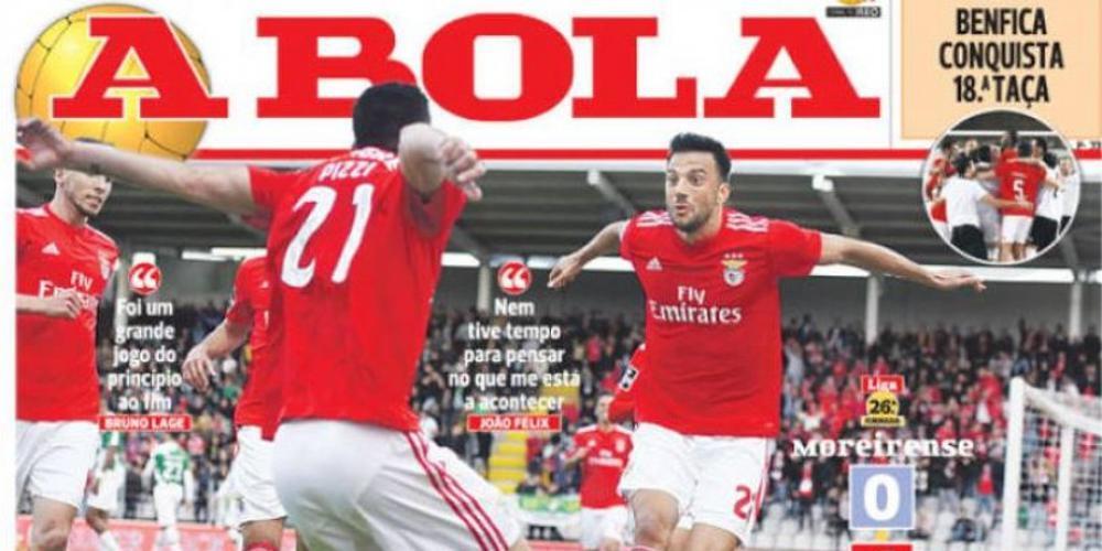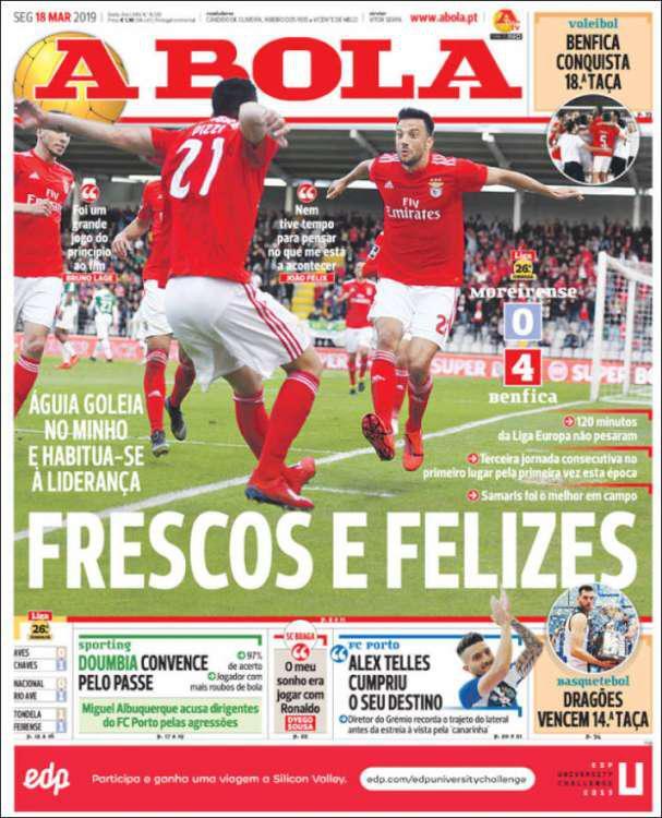 Η A Bola έχει κεντρικό θέμα στο πρωτοσέλιδό της τη νίκη της Μπενφίκα με τη φωτογραφία του Σάμαρη και των συμπαικτών του να πανηγυρίζουν, γράφοντας: «Φρέσκοι και χαρούμενοι».