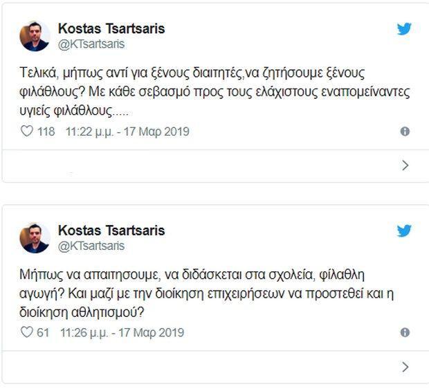 Λίγο αργότερα μάλιστα είχε και νέο ξέσπασμα, γράφοντας: «Μήπως να απαιτήσουμε, να διδάσκεται στα σχολεία, φίλαθλη αγωγή? Και μαζί με την διοίκηση επιχειρήσεων να προστεθεί και η διοίκηση αθλητισμού;»