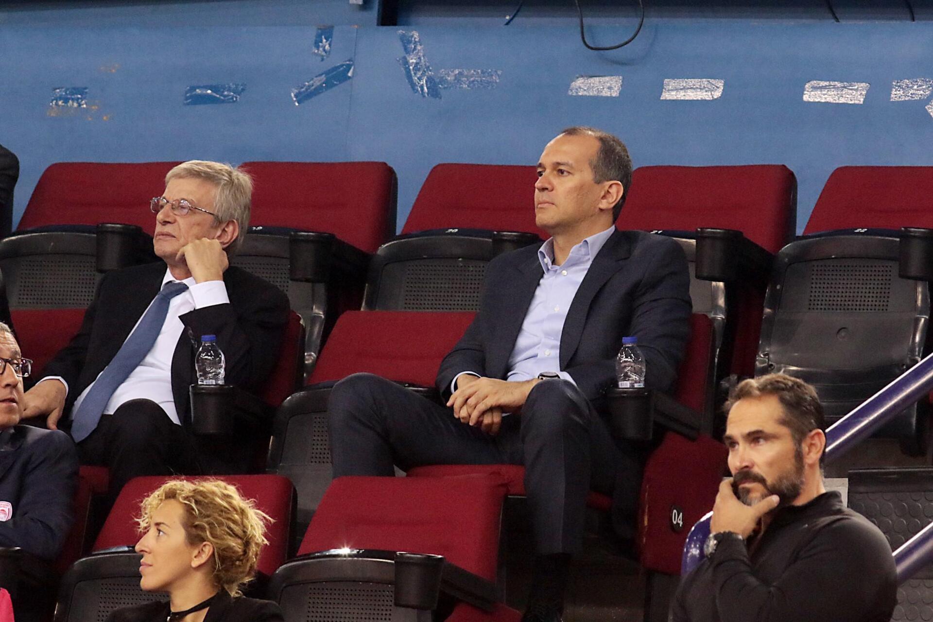 Οι ιδιοκτήτες του Ολυμπιακού, Γιώργος και Παναγιώτης Αγγελόπουλος έδωσαν το παρών στο γήπεδό μαζί με τον αδερφό του για να παρακολουθήσουν την ομάδα τους αλλά μαζί τους δεν ήταν πλεόν η Ιωάννα.
