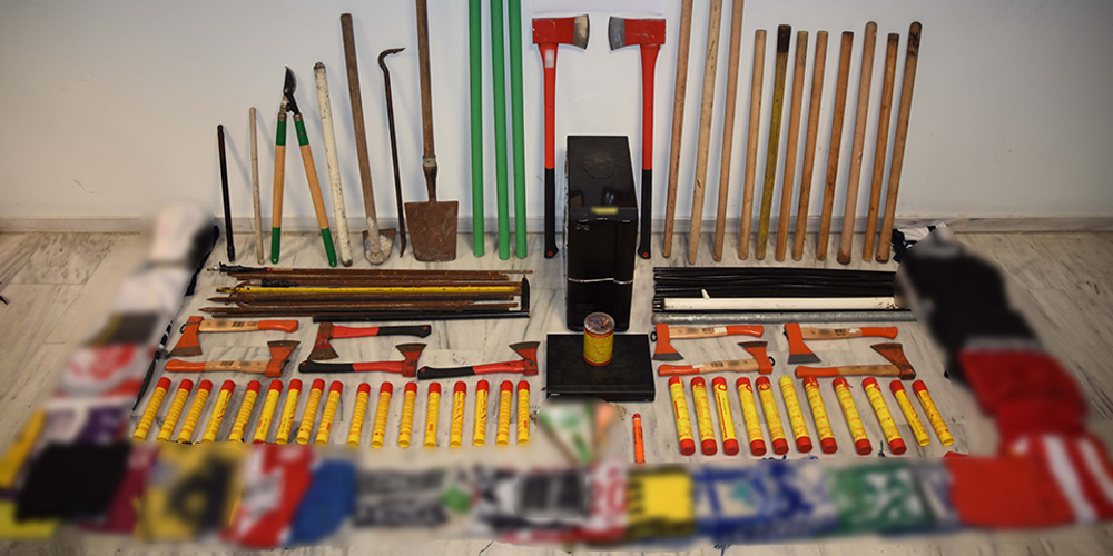 Στον σύνδεσμο στη Χαριλάου βρέθηκαν 16 σιδερένιες βέργες, έντεκα τσεκούρια, 17 ρόπαλα, τέσσερις τσάπες, 30 βεγγαλικά – καπνογόνα, μία μονάδα υπολογιστή και καταγραφικό, καθώς και πανό, φανέλες, κασκόλ κ.α. που έφεραν διακριτικά διαφόρων ομάδων.