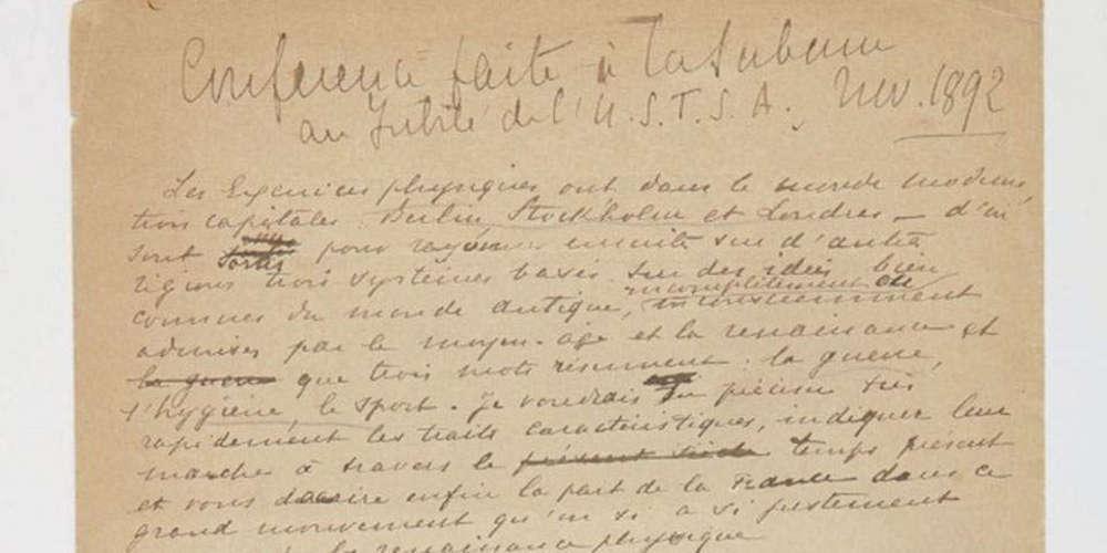 «Το χειρόγραφο των 14 σελίδων, είναι το μόνο γνωστό αντίγραφο του μανιφέστο. Γράφτηκε στα γαλλικά από μια ομιλία του Κουμπερτέν, το 1892, για τον εορτασμό της πέμπτης επετείου της Γαλλικής Ένωσης Στίβου στο Παρίσι», αναφέρεται σε σχετική ανακοίνωση του διάσημου οίκου.