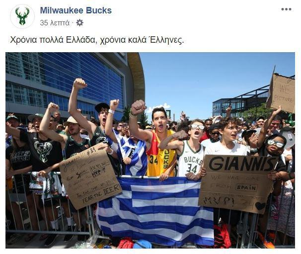 Τα «ελάφια» με αφορμή την εθνική μας επέτειο ευχήθηκαν σε ολους τους Ελληνες χρόνια πολλά. Με μία ανάρτηση που έκαναν στο facebook ανέβασαν οπαδούς των Μπακς με Ελληνικές σημαίες και έγραψαν: «Χρόνια πολλά Ελλάδα, χρόνια καλά Έλληνες!».