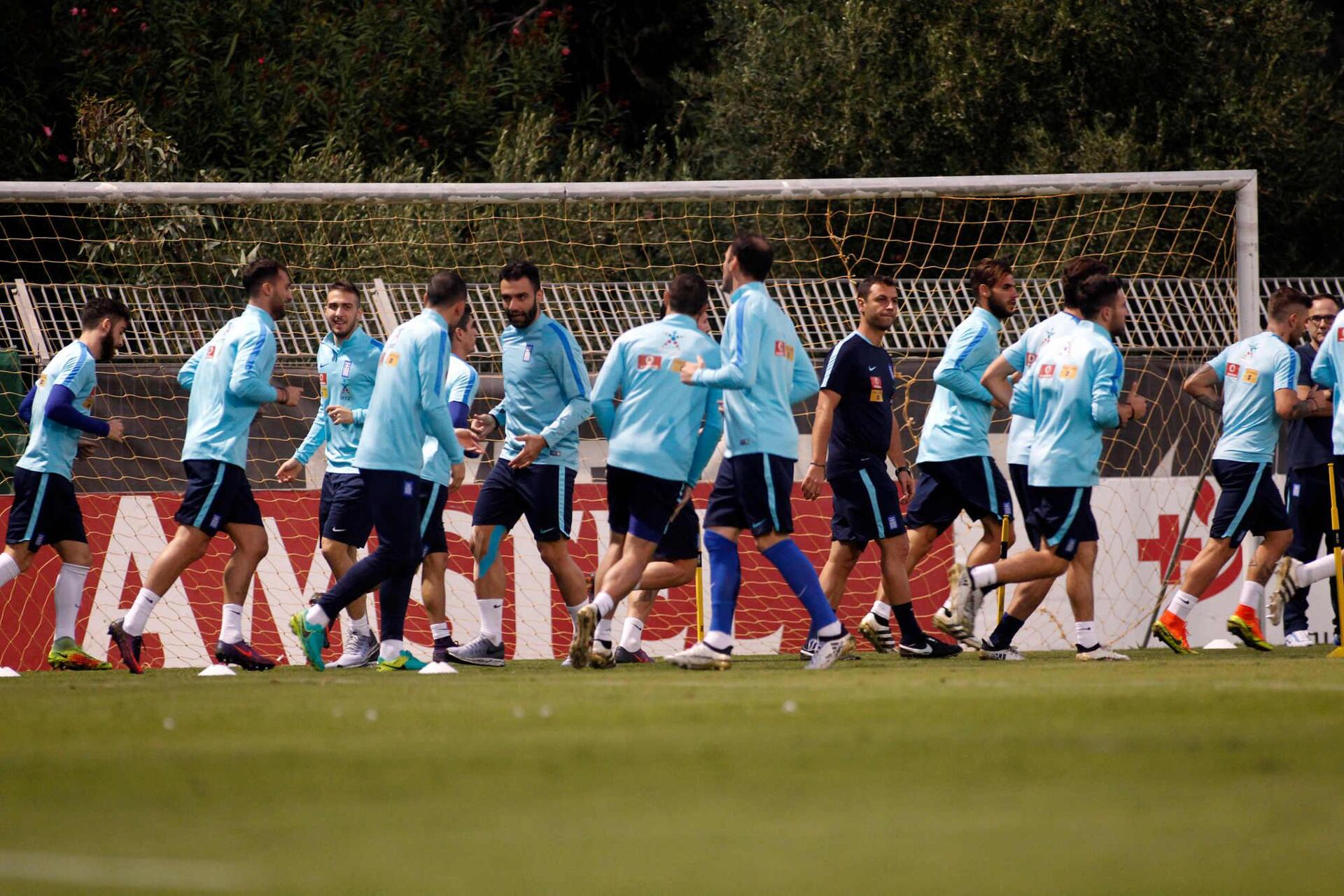 Ο λόγος για τους Μανιάτη, Πέτσο και Μπακασέτα, που ακολούθησαν ατομικό πρόγραμμα λόγω των τραυματισμών που αντιμετωπίζουν και οι οποίοι έχουν καταστήσει τη συμμετοχή τους αμφίβολη. Αντίθετα, ο Μίχαελ Σκίμπε είχε στη διάθεσή του Σιώπη και Κουτρουμπή, που πραγματοποίησαν την πρώτη προπόνησή τους με το αντιπροσωπευτικό συγκρότημα. Οι διεθνείς που αγωνίστηκαν εναντίον της Λευκορωσία και όσοι έχουν πολλούς αγώνες στα πόδια τους με τους συλλόγους τους ακολούθησαν πρόγραμμα αποφόρτισης, ενώ οι υπόλοιποι έκαναν κανονικό πρόγραμμα.