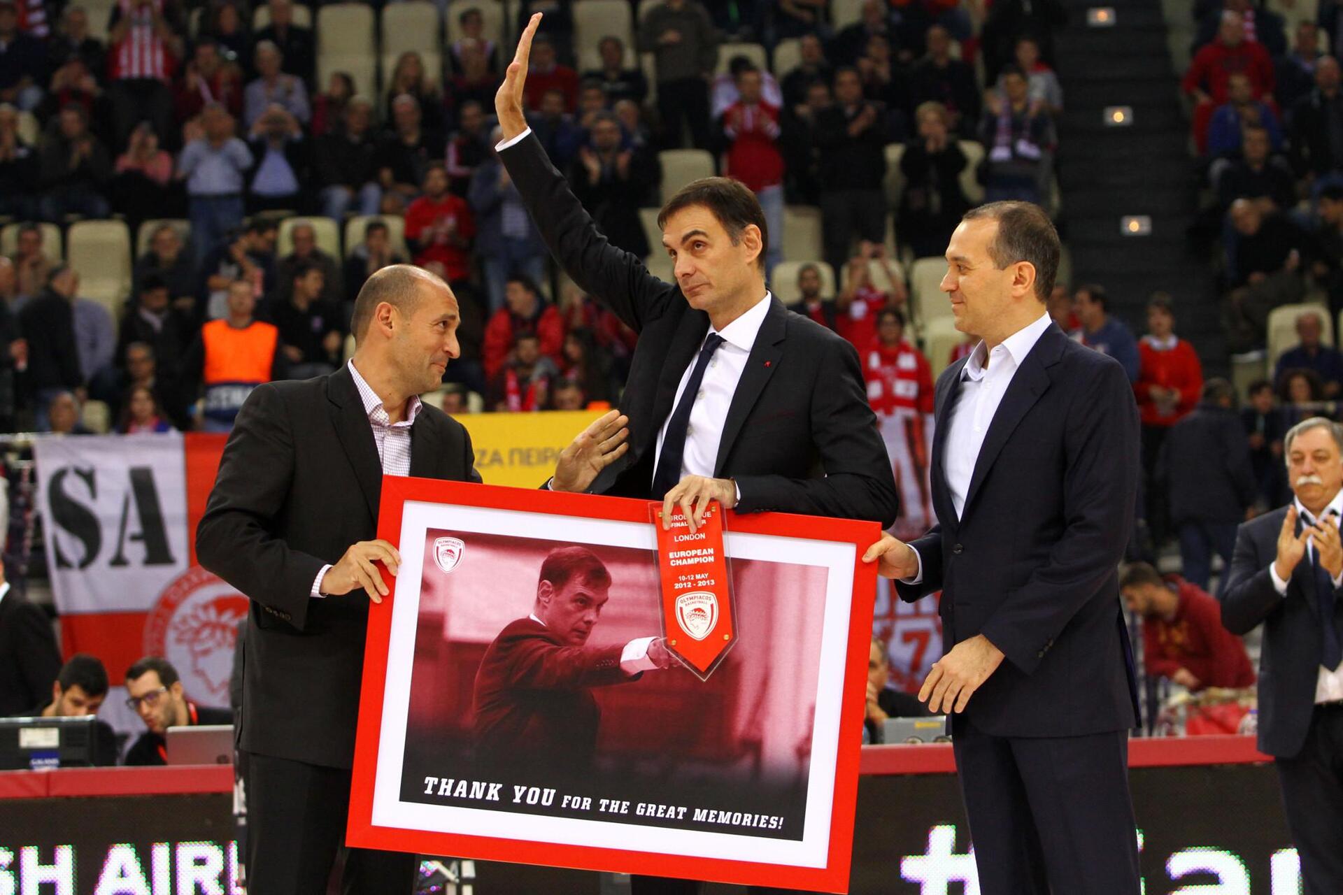 Οι ιδιοκτήτες της ΚΑΕ, Γιώργος και Παναγιώτης Αγγελόπουλος, του χάρισαν ένα κάδρο με το πορτραίτο του από την κατάκτηση της Ευρωλίγκας το 2013 στο Λονδίνο.
