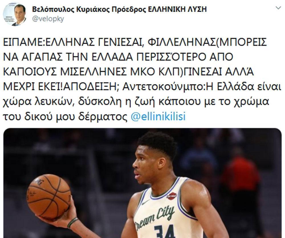 «ΕΙΠΑΜΕ: ΕΛΛΗΝΑΣ ΓΕΝΙΕΣΑΙ, ΦΙΛΛΕΛΗΝΑΣ(ΜΠΟΡΕΙΣ ΝΑ ΑΓΑΠΑΣ ΤΗΝ ΕΛΛΑΔΑ ΠΕΡΙΣΣΌΤΕΡΟ ΑΠΟ ΚΑΠΟΙΟΥΣ ΜΙΣΕΛΛΗΝΕΣ ΜΚΟ ΚΛΠ)ΓΙΝΕΣΑΙ ΑΛΛΆ ΜΕΧΡΙ ΕΚΕΊ! ΑΠΟΔΕΙΞΗ; Αντετοκούνμπο:Η Ελλάδα είναι χώρα λευκών, δύσκολη η ζωή κάποιου με το χρώμα του δικού μου δέρματος» έγραψε ο Κυριάκος Βελόπουλος.