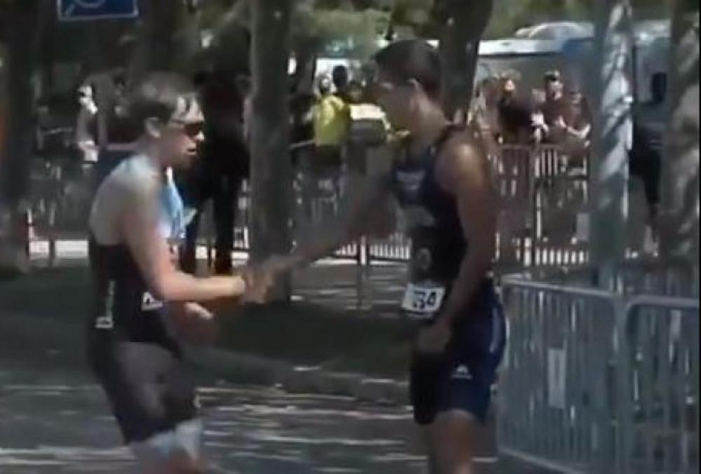 When Spanish triathlete Diego Méntriga noticed that British triathlete James Teagle went the wrong way before finish line of Santander Triathlon,Mentriga waited for him so he could take what he says is his deserved 3rd place.“He was in front of me the whole time.He deserved it.” pic.twitter.com/5Mo52QZ3rJ