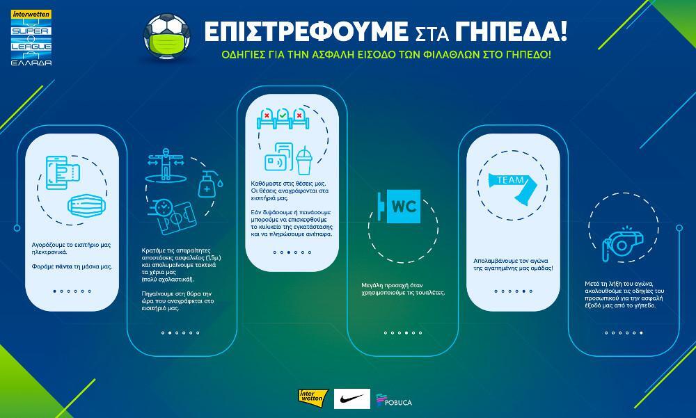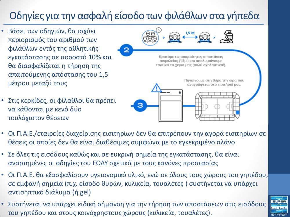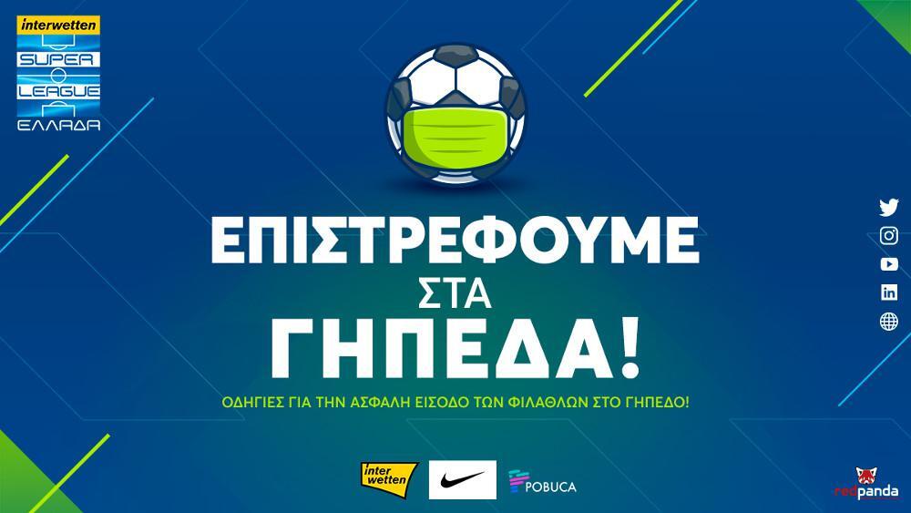 Με αφετηρία την 7η αγωνιστική του Πρωταθλήματος Super League 1, στις 31 Οκτωβρίου και 1 Νοεμβρίου, θα επιτρέπεται η είσοδος των φιλάθλων σε ποσοστό 10% της συνολικής χωρητικότητας ανά θύρα, με ανώτατο επιτρεπτό όριο τους 3.500 θεατές.