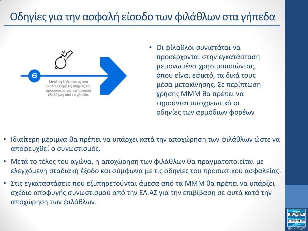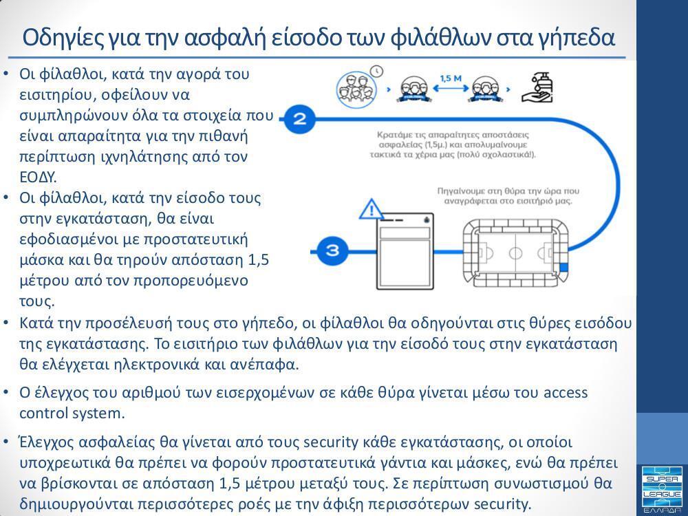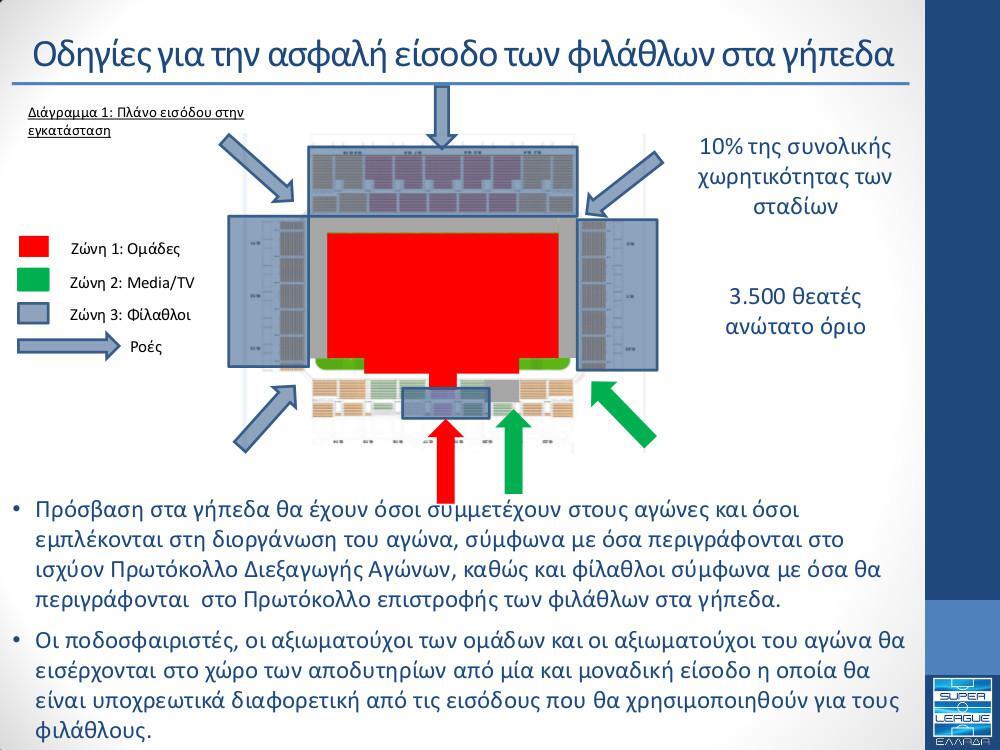 – Οι γηπεδούχες Π.Α.Ε. οφείλουν να αποστέλλουν σε ψηφιακή μορφή, στις αρμόδιες εποπτικές αρχές, φάκελο που θα συμπεριλαμβάνει το πλάνο θέσεων και τα εισιτήρια.