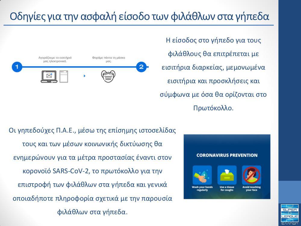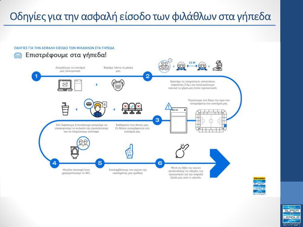 – Οι φίλαθλοι θα πρέπει να κάθονται στη θέση που αναγράφεται στο εισιτήριο τους, τηρώντας την απόσταση τουλάχιστον 1,5 μέτρου ανάμεσά τους και φορώντας προστατευτική μάσκα για τον Covid-19.