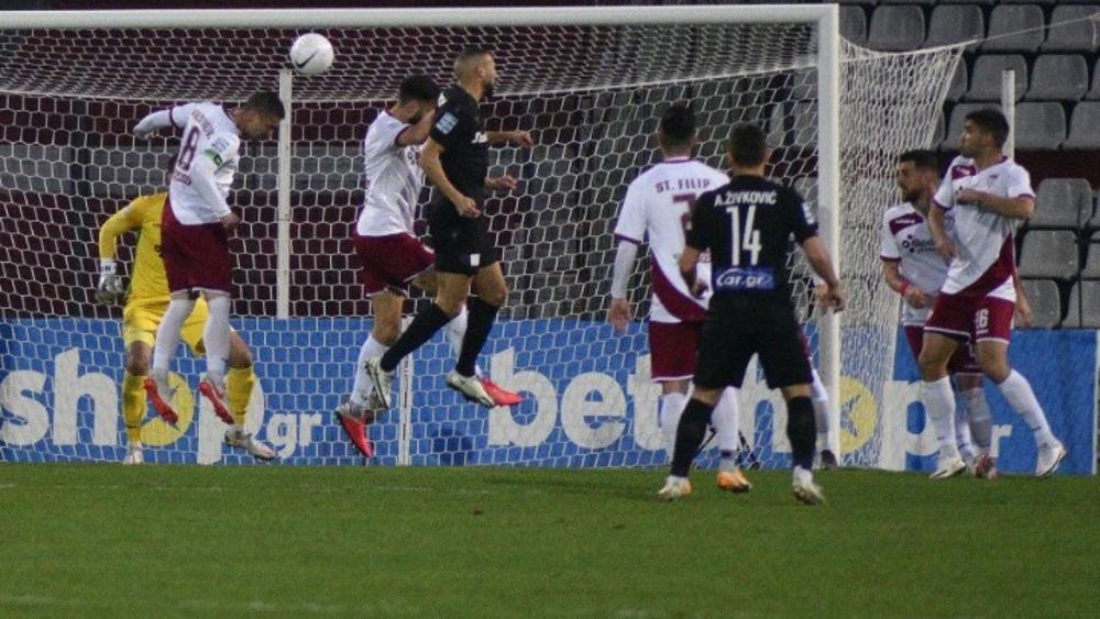 Οι «βυσσινί» προηγήθηκαν με ένα υπέροχο γκολ του Δημήτρη Πινακά και κρατούσαν το «τρίποντο» στα πόδια τους μέχρι το 96ο λεπτό, σημείο που ισοφάρισαν οι φλύαροι φιλοξενούμενοι, χάρη σε πέναλτι του Αντελίνο Βιεϊρίνια.