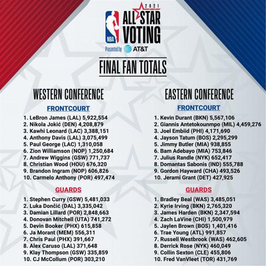 Επίσης ο ηγέτης των λιμνάνθρωπων βγήκε πρώτος στην ψηφοφορία του κόσμου για το NBA All Star Game με 5,922,554 ψήφους. Ακολουθούν ο Κέβιν Ντουράντ με 5,567,106 ψήφους , ο Στεφ Κάρι με 5,481,033 ψήφους και ο Γιάννης Αντετοκούνμπο με 4,459,276 ψήφους.