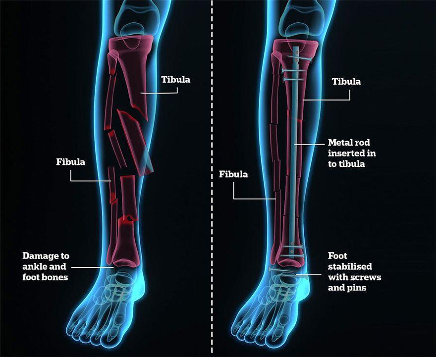 Τα δύο οστά στο δεξί του γόνατο υπέστησαν σοβαρή ζημιά με αποτέλεσμα οι χειρούργοι να τοποθετήσουν μία μεταλλική λάμα για να σταθεροποιήσει το πόδι του, ενώ χρησιμοποιήθηκαν και ειδικές βίδες για τη σταθεροποίηση και των υπολοίπων καταγμάτων που υπέστη χαμηλά στο πόδι, αλλά και στον αστράγαλο.