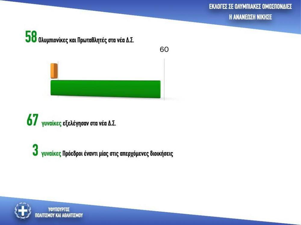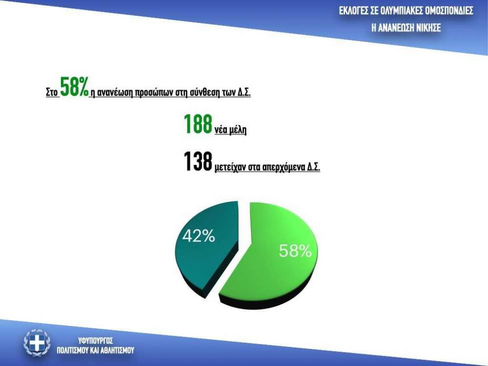 - Στο 16% ανήλθε η συμμετοχή των αθλητών/τριών (58 Ολυμπιονίκες και Πρωταθλητές) ως μέλη στα νέα ΔΣ. Αυτή η συμμετοχή θα αυξηθεί σημαντικά, καθώς σε αρκετά ΔΣ Ομοσπονδιών δεν έχει ακόμα οριστεί και ο επιπλέον, εκ του νόμου, εκπρόσωπος των αθλητών/τριών.