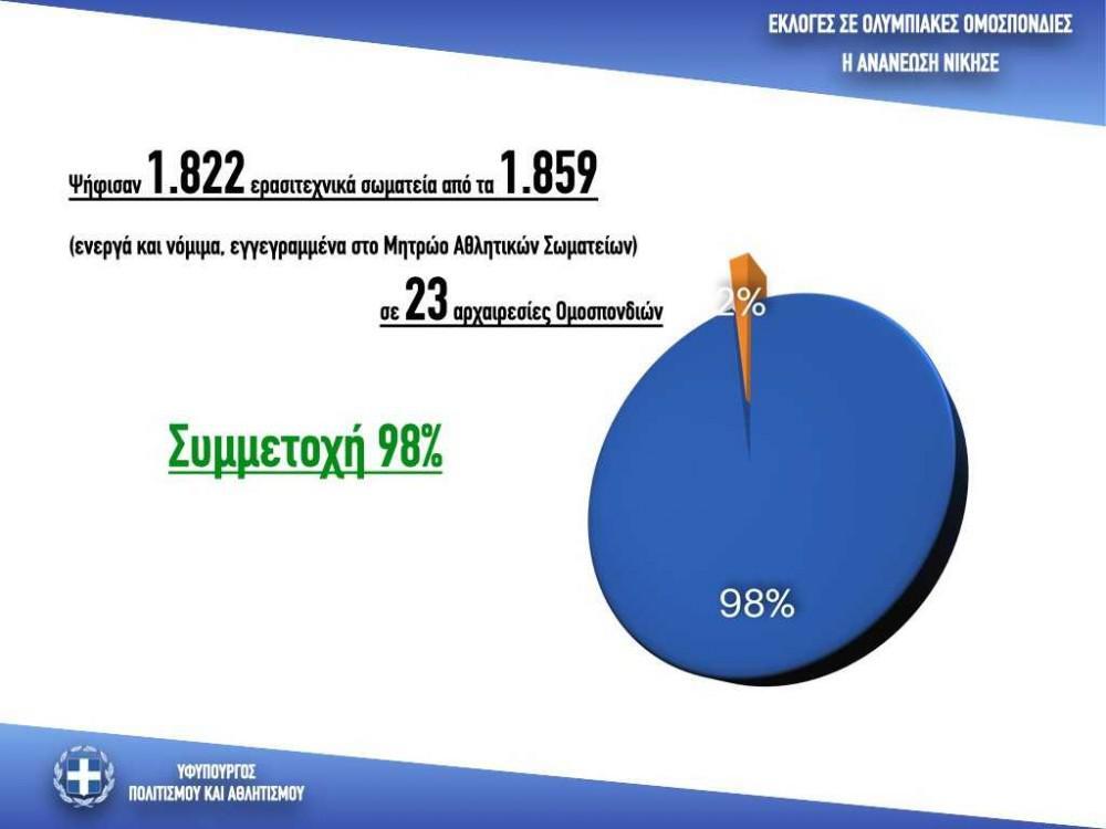 - Στις αρχαιρεσίες σε 23 Ολυμπιακές Ομοσπονδίες η συμμετοχή ήταν 98%! Ψήφισαν 1.822 ερασιτεχνικά σωματεία (στα 1.859 που είχαν δικαίωμα, ως ενεργά και νόμιμα, εγγεγραμμένα στο Μητρώο Αθλητικών Σωματείων), χωρίς π.χ. να συνυπολογίζονται περισσότερα από 500 σωματεία που θα μετάσχουν στις εκλογές -προσεχώς- της Καλαθοσφαίρισης (μπάσκετ).