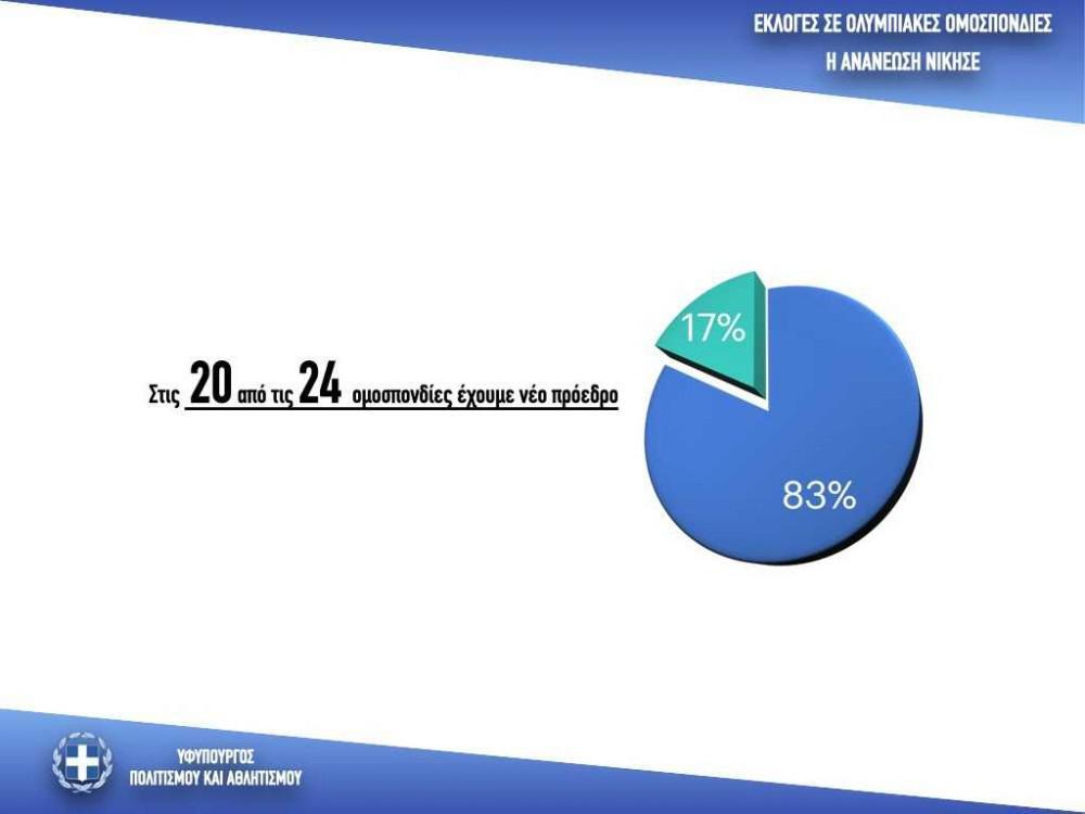 - Στις 20 από τις 24 Ομοσπονδίες (83%) έχουμε νέο πρόεδρο (συνυπολογιζόμενης και της ΕΠΟ -Θοδωρής Ζαγοράκης- στην οποία δεν ψηφίζουν τα σωματεία, αλλά οι Ενώσεις).