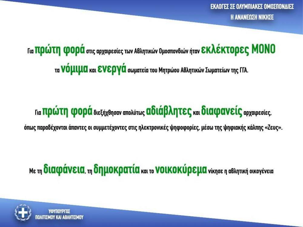 «Οι εκλογικές διαδικασίες ολοκληρώθηκαν με απόλυτη τάξη, απόλυτη διαφάνεια και με υψηλότατο βαθμό ανανέωσης των αθλητικών φορέων.