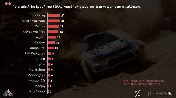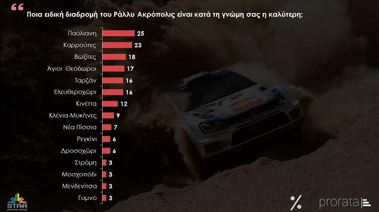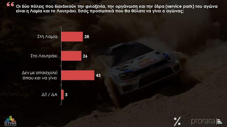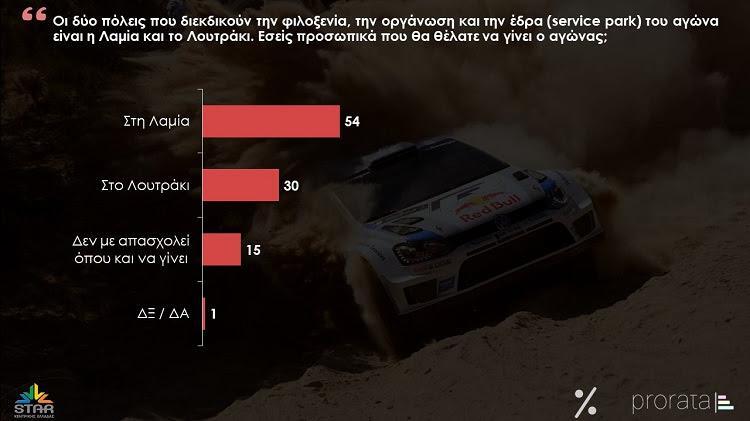 Στο ίδιο ερώτημα, παρατηρούμε ότι όσοι έχουν παρακολουθήσει από κοντά ειδικές διαδρομές του Ράλλυ Ακρόπολις επιθυμούν να γίνει ο αγώνας στη Λαμία σε ποσοστό 54%, με ένα 30% να λέει στο Λουτράκι, ενώ μόλις 15% δηλώνει ότι δεν έχει πρόβλημα όπου και να γίνει ο αγώνας.