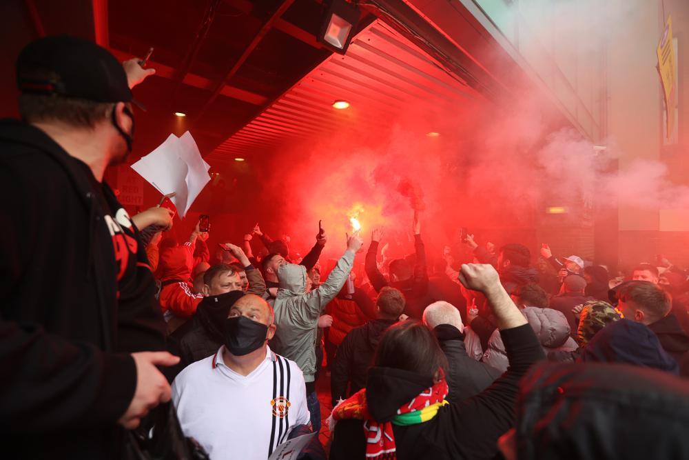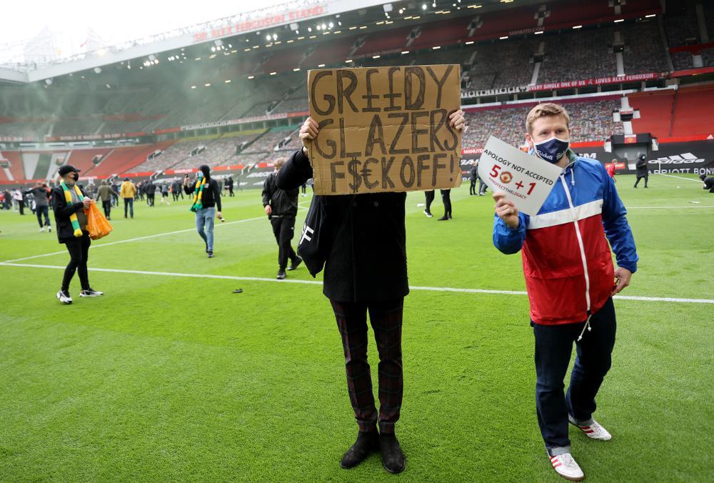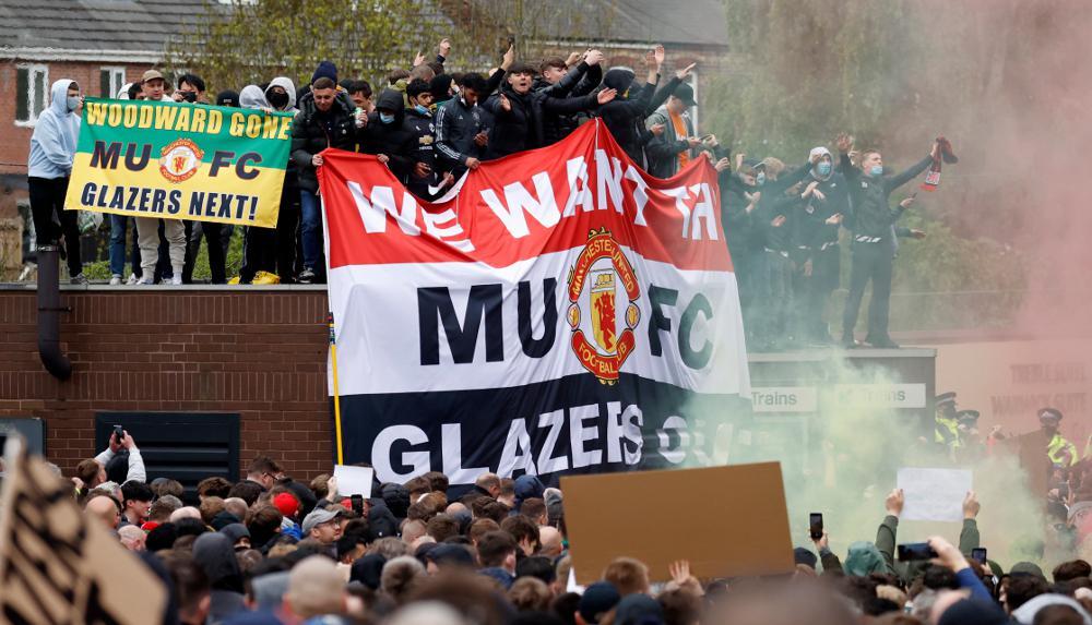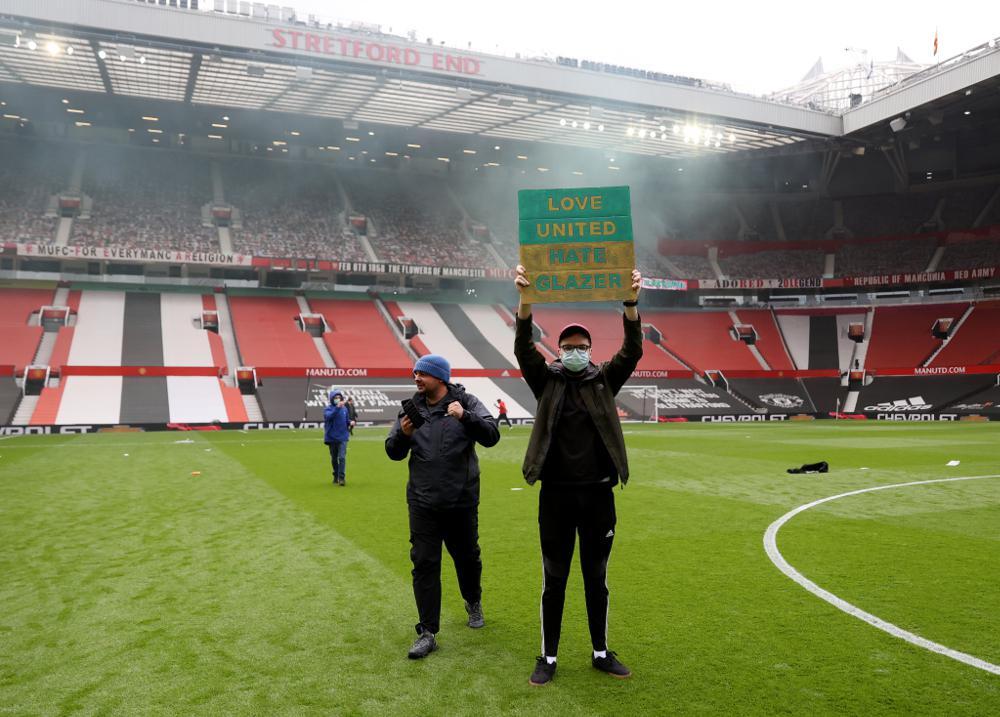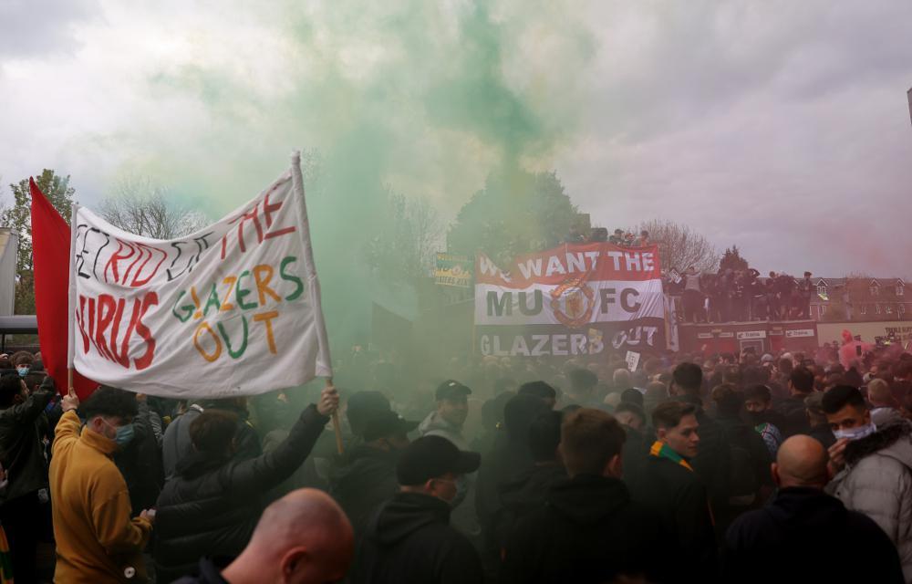 Λίγες ώρες πριν το μεγάλο ντέρμπι με τη Λίβερπουλ (02/5, 18:30), μεγάλη μερίδα οπαδών της Γιουνάιτεντ εισέβαλε στον αγωνιστικό χώρο του «Ολντ Τράφορντ», κρατώντας πανό και καπνογόνα, ενώ παράλληλα φωνάζοντας συνθήματα κατά των Γκλέιζερ, ζητώντας παράλληλα την παραίτησή τους από τα ηνία του συλλόγου. Επιπλέον, επιχείρησαν να εμποδίσουν την αποστολή του Όλε Γκούναρ Σόλσκιερ να φύγει από το ξενοδοχείο.